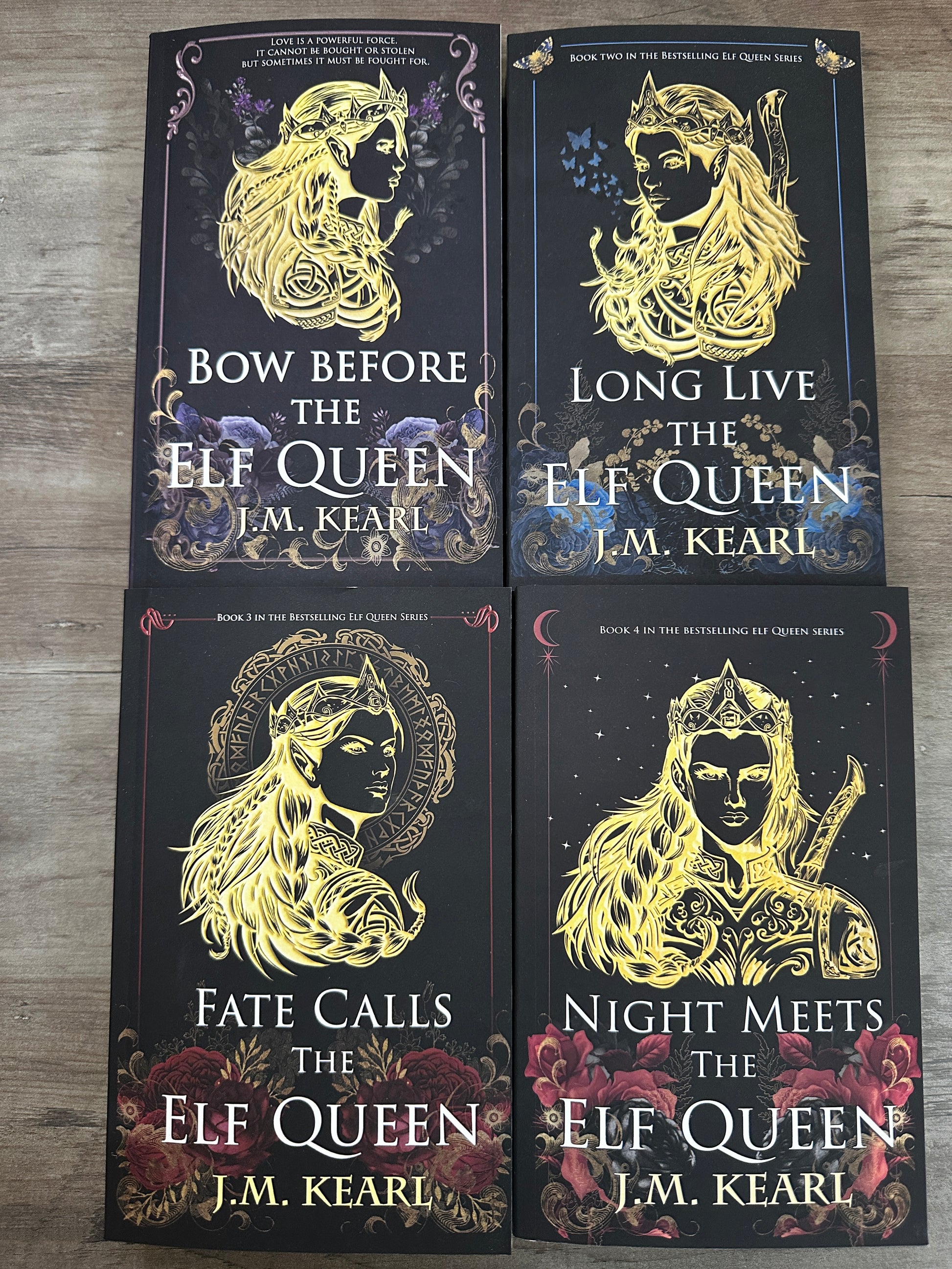 Signed 4 book paperback set of The Elf Queen series by J.M. Kearl! This premium bundle comes with several character art prints, as well as a bookmark & stickers, all in a gorgeous custom box!